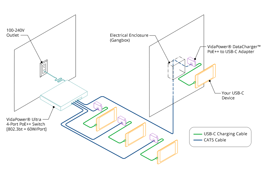 Sluit gewoon uw PoE-kabel aan van een VidaPower® Ultra of andere 802.3bt Injector / Switch en vervolgens uw USB-C-kabel op het apparaat... En dat is het! Voor de meeste apparaten is geen configuratie vereist!