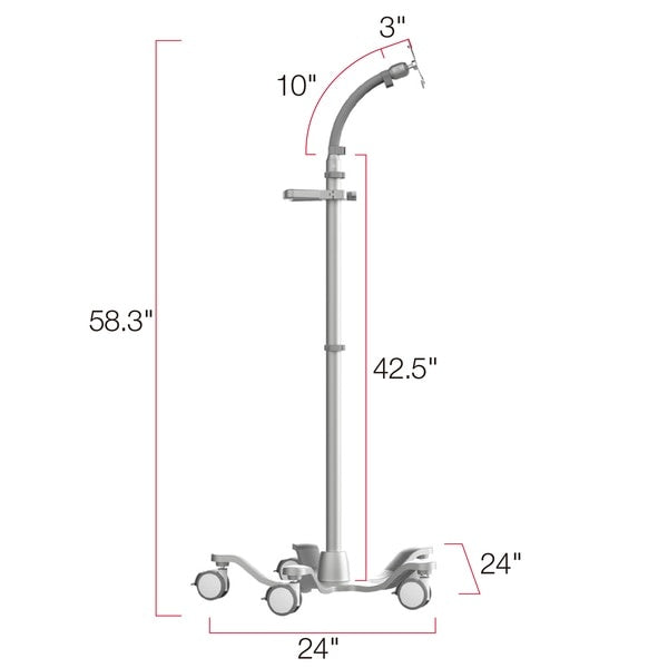 Cart Specifications Material: Mixed materials; main material aluminum alloy, carbon steel and silicone Weight: 12.6 lbs Maximum load capacity: Up to 6 lbs Height: 58.3" (146 cm) Width: 24" (60 cm) Cart base diameter: 24" (60 cm) Joints: 1" spherical joint at tablet connection Connection: VESA 50 x 50 mm, 75 x 75 mm, 100 x 100 mm Compatibility: VESA standard mounting & Enclosures