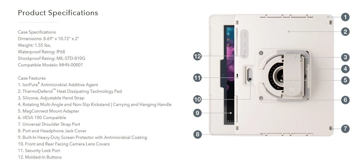 Deze volledig gesloten behuizing is voorzien van ThermoDefend ™, onze nieuwe gepatenteerde warmteafvoertechnologie om de prestaties van het apparaat te behouden. De case is doordrenkt met IonPure®, een antimicrobieel middel, om te helpen voorkomen dat bacteriën en schimmels groeien. Belangrijk is ook dat het niet gaat om een coating, maar dat deze stof is ingebracht tijdens de productie. Hierdoor kan de case langere tijd gebruikt worden ook met hoge temperaturen, of als de tablet zelf opwarmt door langduring gebruik. Ook over de binnenkant is nagedacht. Speciale reinigingsinstructies zijn ontwikkeld per case zodat je ook de binnenkant goed schoon kan houden en je case blijft voldoen aan de hoge eisen. Er is ook zeker nagedacht over de reguliere reiniging vereisten die moeten worden nageleefd in de zorginstellingen. De ingebouwde screen protector kan gemakkelijk worden schoongemaakt, en voldoet dus zo aan alle vereisten.