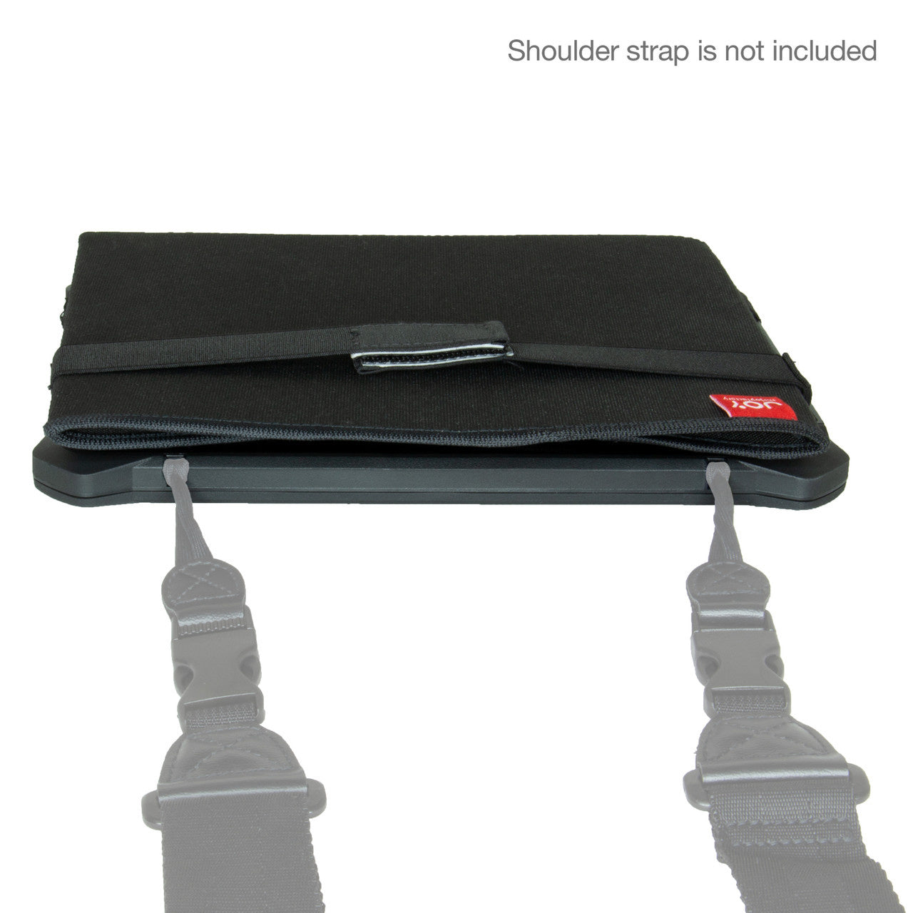 Om de mobiliteit van het apparaat uit te breiden, kan de zonneklep worden gecombineerd met een aXtion-schouderriem. De schouderriem positioneert het apparaat aan de zijkant van de gebruiker wanneer het niet in gebruik is, zodat je er gemakkelijk bij kunt wanneer het nodig is.