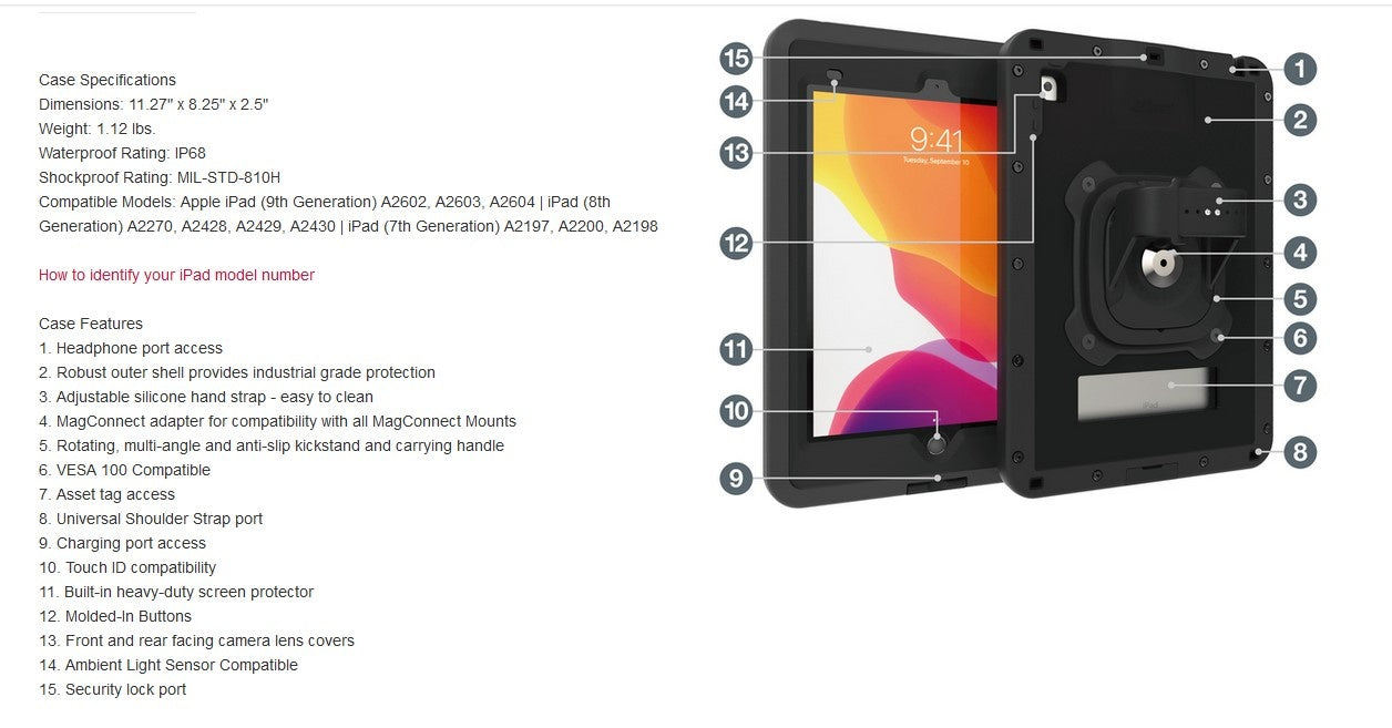 - Schokbestendig van militaire kwaliteit (MIL-STD-810G) en waterdicht (IP-68 gecertificeerd) - Robuuste case is schokbestendig gecertificeerd (MIL-STD-810H) en waterdicht met een IP68 rating - Compitabel met MagConnect en VESA 100-montagesysteem - MagConnect magnetische technologie zorgt voor eenvoudig en snel bevestigen en losmaken op alle MagConnect compatibele houders - Kenmerken: schermbeschermer, slot voor kabelslot, afdekplaatjes voor knoppen en poorten, draaibare handriem en kickstand - Maximaliseer uw mobiliteit met deze optionele accessoires: Universele schouderriem - Kan schoongemaakt worden met 'Hospital Grade' schoonmaakdoekjes (bv Caviwipes, Sani-Cloth of Clorox Wipes)