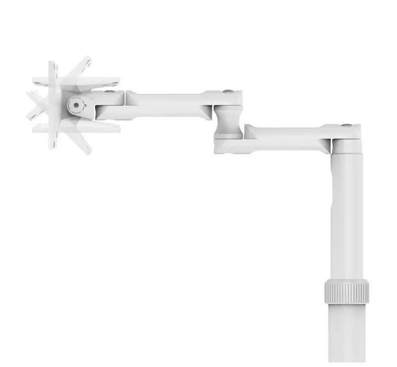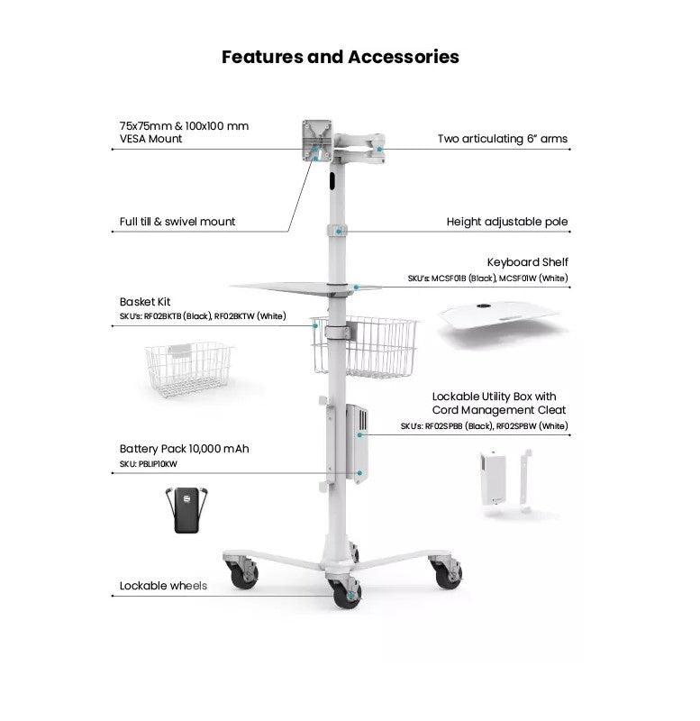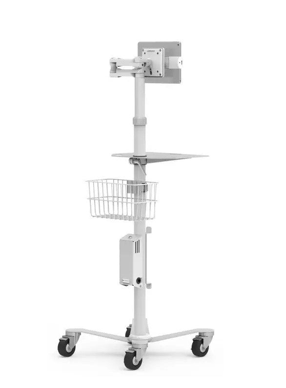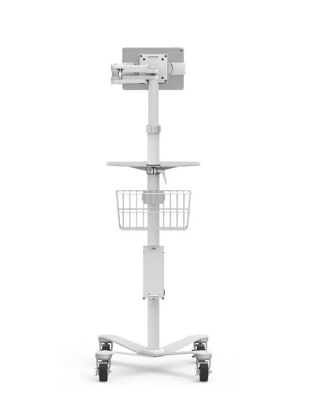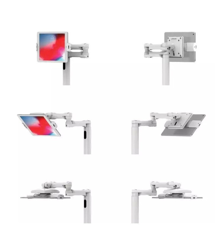 Cling Adjustable Universal Mount included (fits most tablets up to 13” diagonal) - Maximum monitor size/weight: 15” (38.1 mm) / 5 lbs. (2.27 kg) - VESA plate tilts up 90 degree & down 90 degree - Pan Monitor Arm for the Perfect Viewing Angle - Two articulating 6” arms provide 12” of Extension - Adjusts to True Sitting and Standing Height - Locking casters keep the wheeled stand in an anchored position - Smooth powder-coated surfaces stand up to commercial cleaning - Through Pole Cable Management