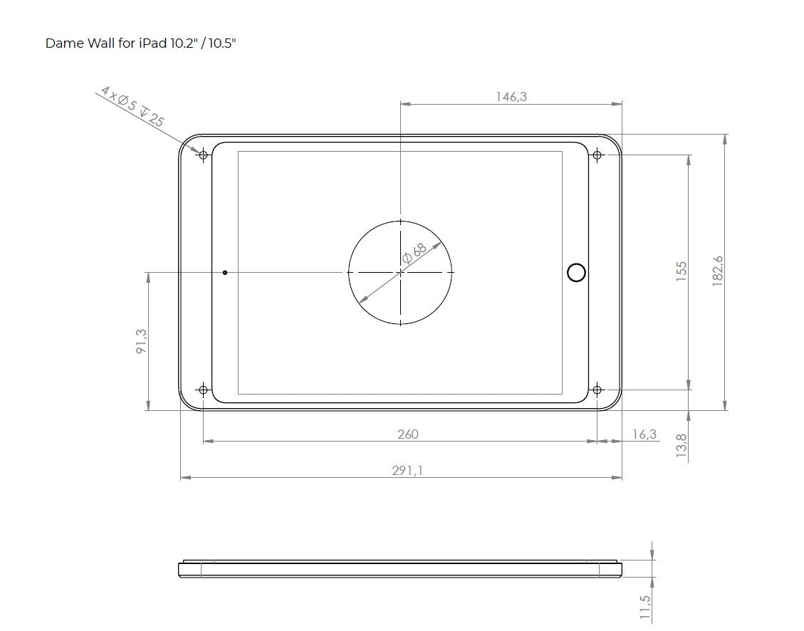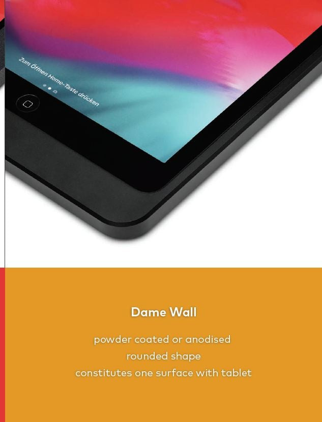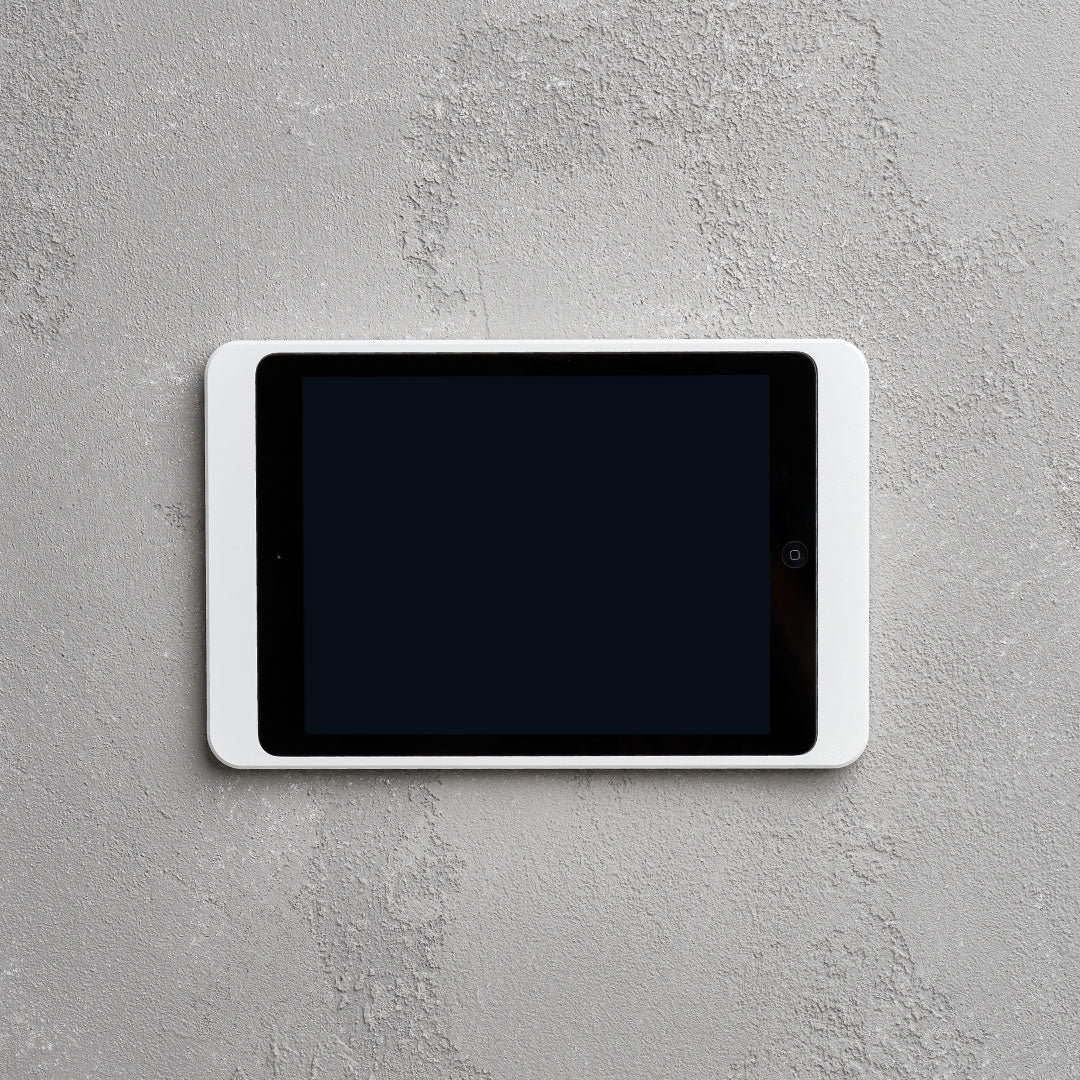Strakke aluminium wandhouder geschikt voor iPad 10.2/10.5 tablets. Het frame wordt direct op de muur bevestigd. Het frontpaneel is magnetisch en dus snel afneembaar. Er is intern ruimte voor aansluiting van iPad Lightning kabel.