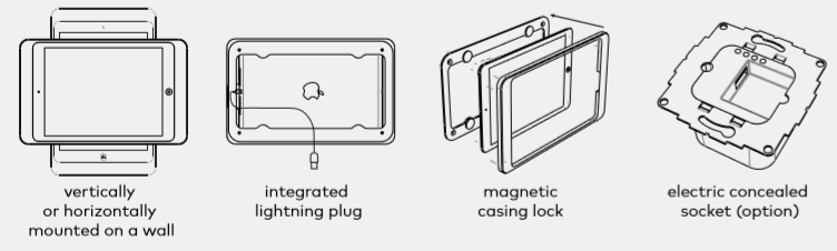 Strakke aluminium wandhouder geschikt voor iPad 10.9/11-inch tablets. Het frame wordt direct op de muur bevestigd. Het frontpaneel is magnetisch en dus snel afneembaar. Er is intern ruimte voor aansluiting van iPad kabel.