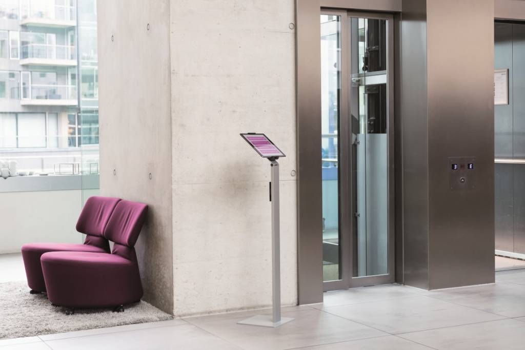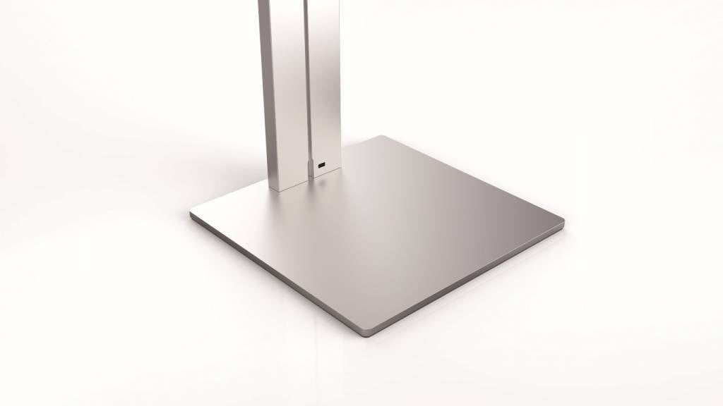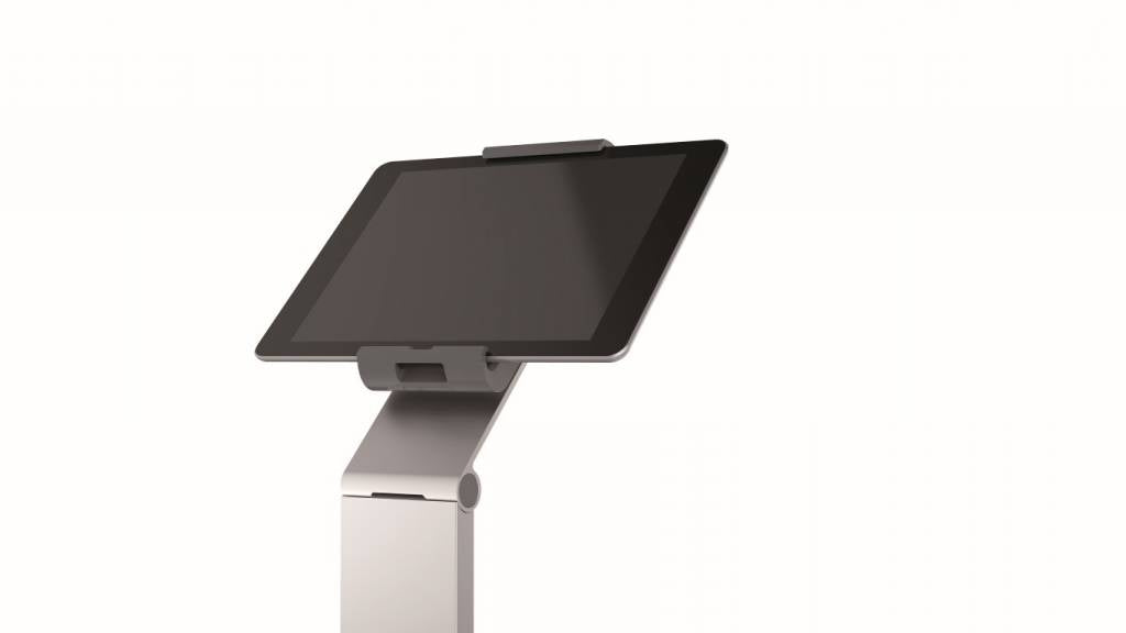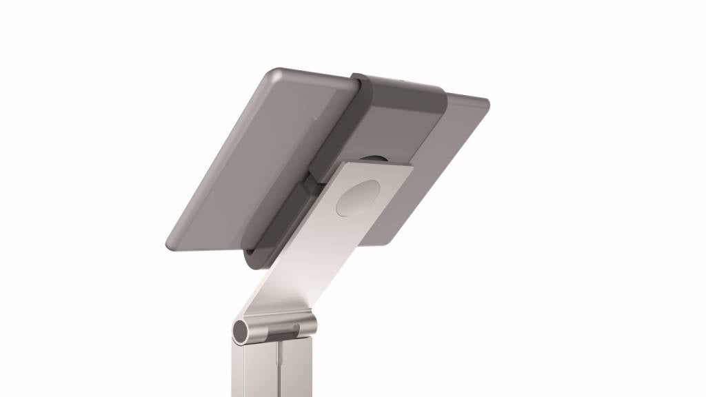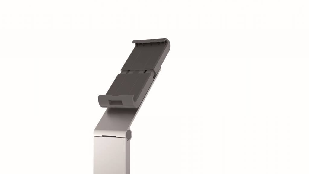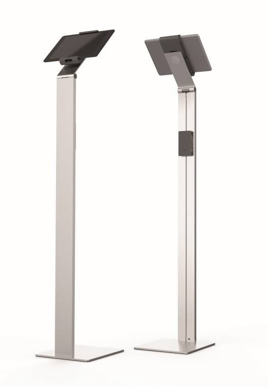Fraaie vloerstandaard voor een professioneel gebruik van tablets. Tablet naar wens en gebruik vrij af te nemen of te zekeren tegen diefstal. Combinatie van aluminium staander met kabelmanagement, strakke ABS kunststof klemhouder met inbusslot en stabiele stalen vloerplaat.