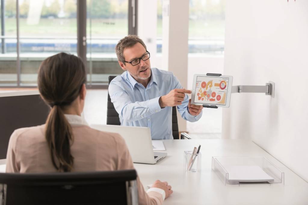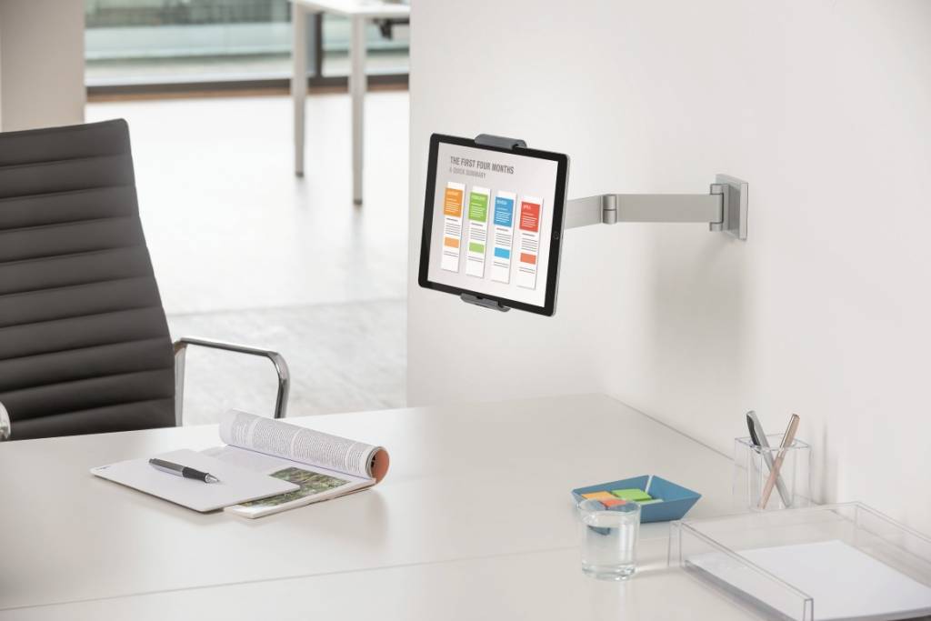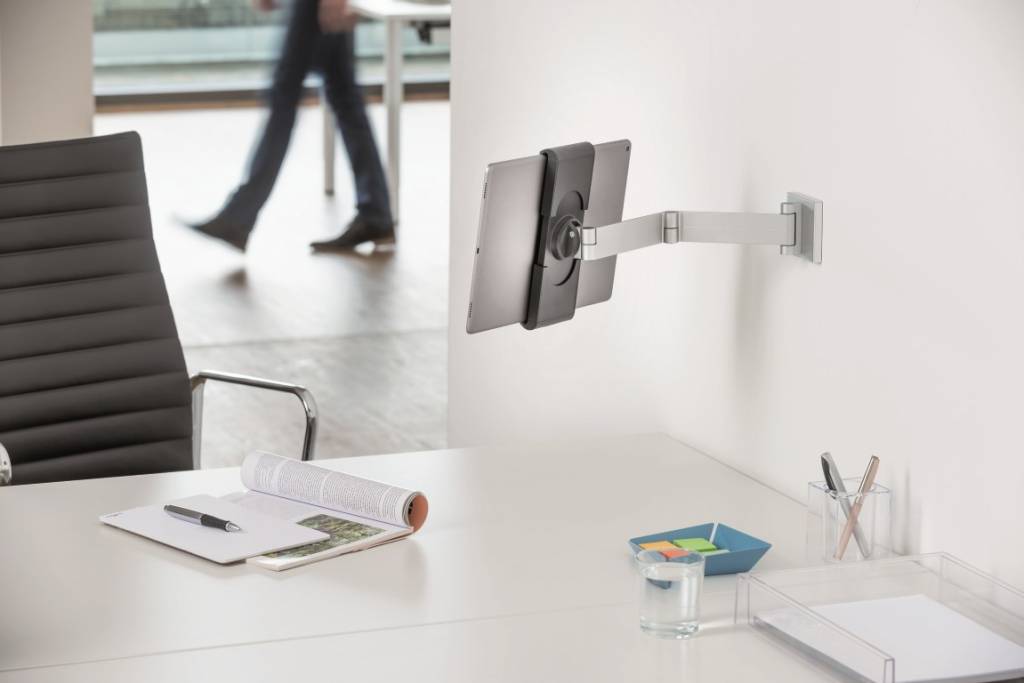 Tablethouder voor de wand, met flexibele zwenkarm. Voor een professioneel gebruik van tablets.