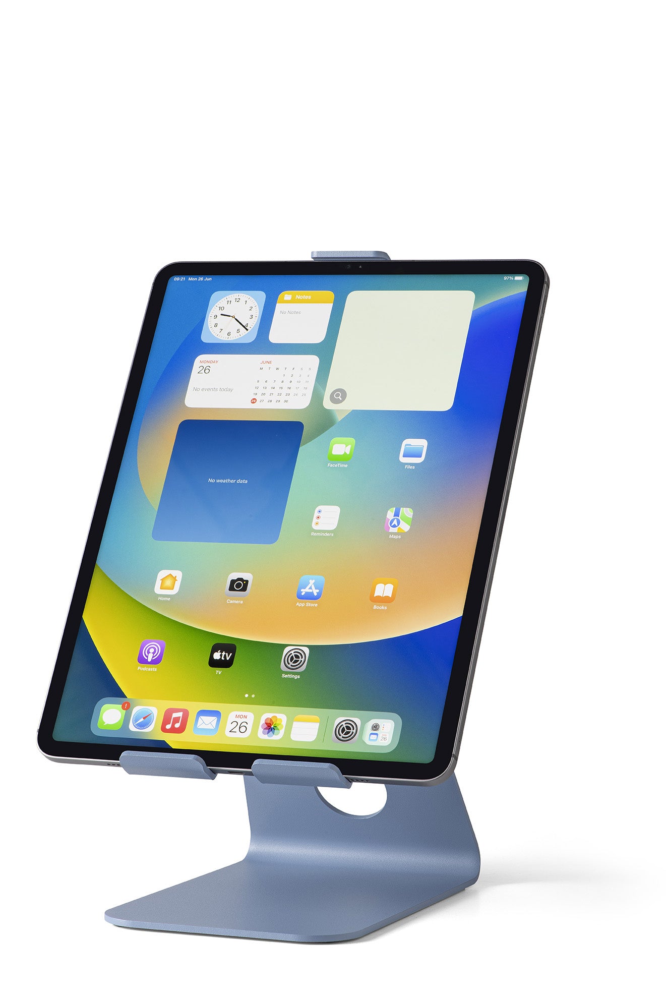 De hoogte en kijkhoek bij deze tablet tafelstandaard is ideaal bij intensief gebruik en komt je houding en spierbelasting ten goede. De Tabdoq Finn universele tablet desktop stand is geschikt voor iedere tablet van 8-13 inch zowel in landscape (liggend) én portrait (staand).