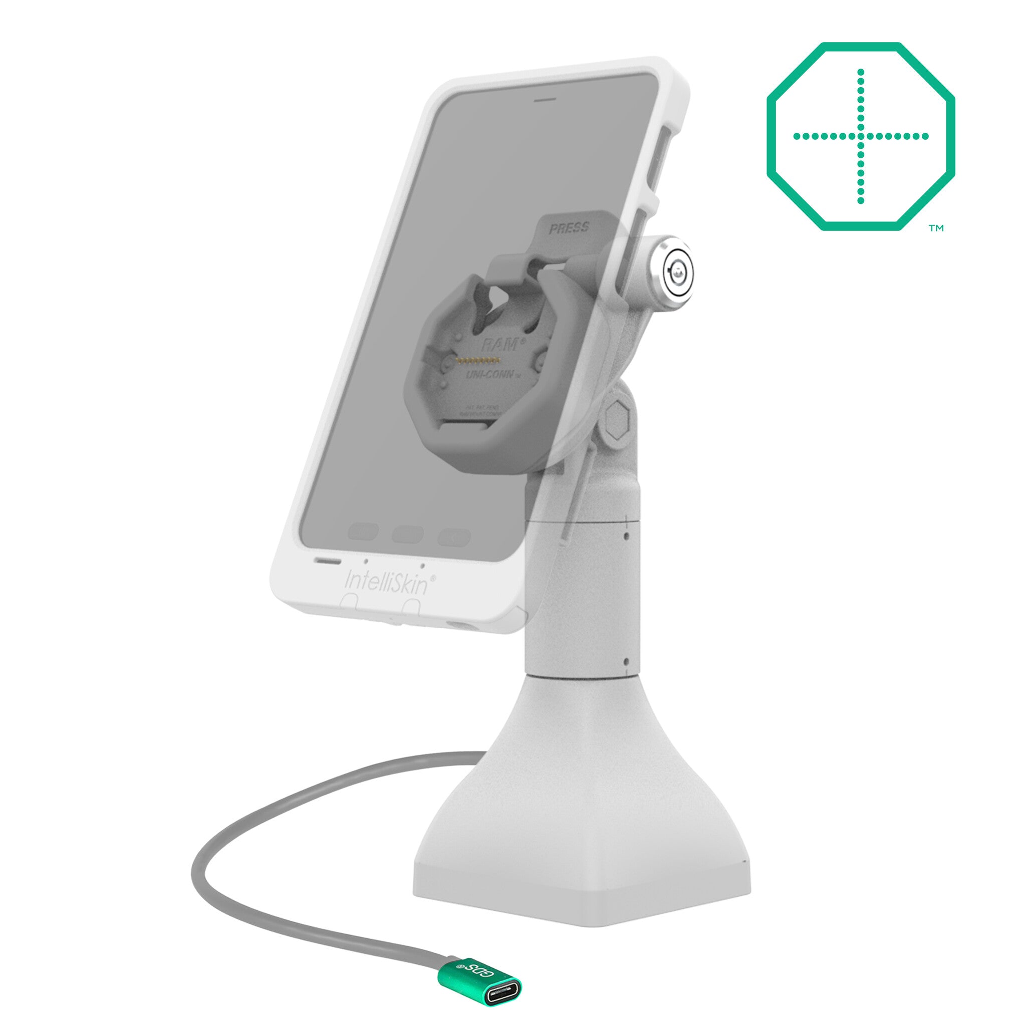 Het GDS® Uni-Conn™ Powered 17,78 cm (7") Pedestal Dock met slot en oplaadfunctie via USB-C (RAM-GDS-DOCKLR-D11-7-U3C) is een vrijstaand dock op voetstuk. Het is geschikt voor apparaten in een IntelliSkin Thin-Case met Pogo Pads aan de achterzijde.