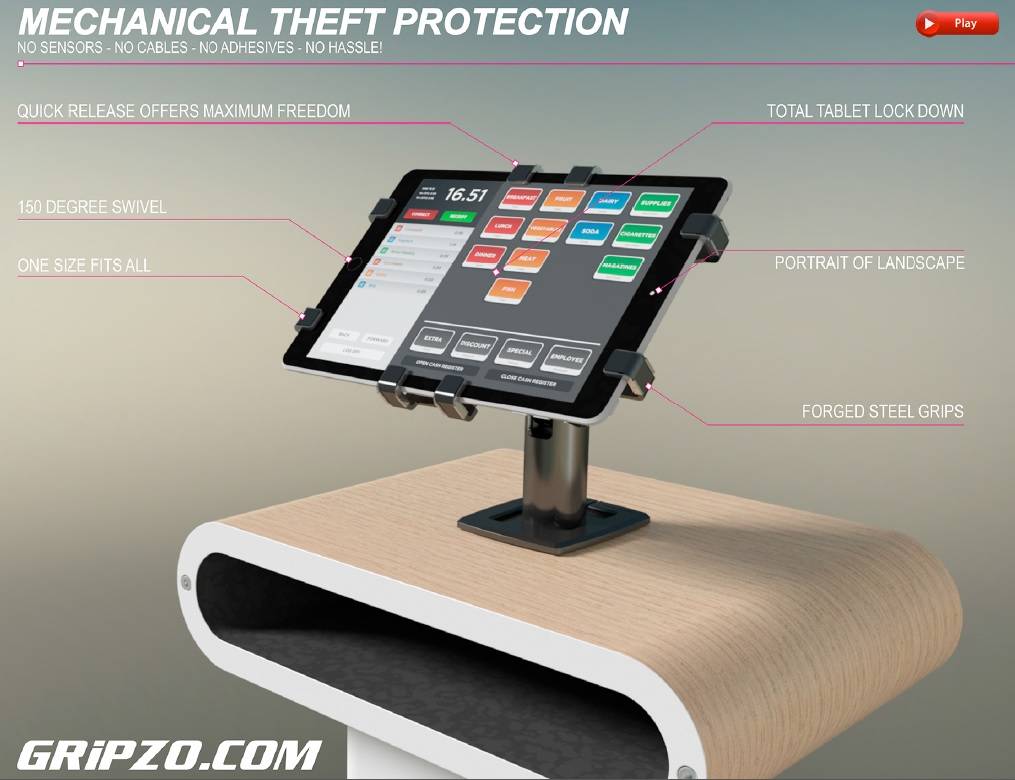 De Gripzo Tablet Grip swivel  is uniek in zijn soort. Zeer stevige klemmen beveiligen de tablet. Door het gepatenteerde sluitsysteem is de tablet snel te ontgrendelen. Bijzonder geschikt voor gebruik op kantoor, restaurant, school en retail. Denk aan vrij gebruik in de winkel ("tablet-assisted sales") van de iPad en tablet en toch de mogelijkheid om snel een anti-diefstal beveiliging aan te brengen.