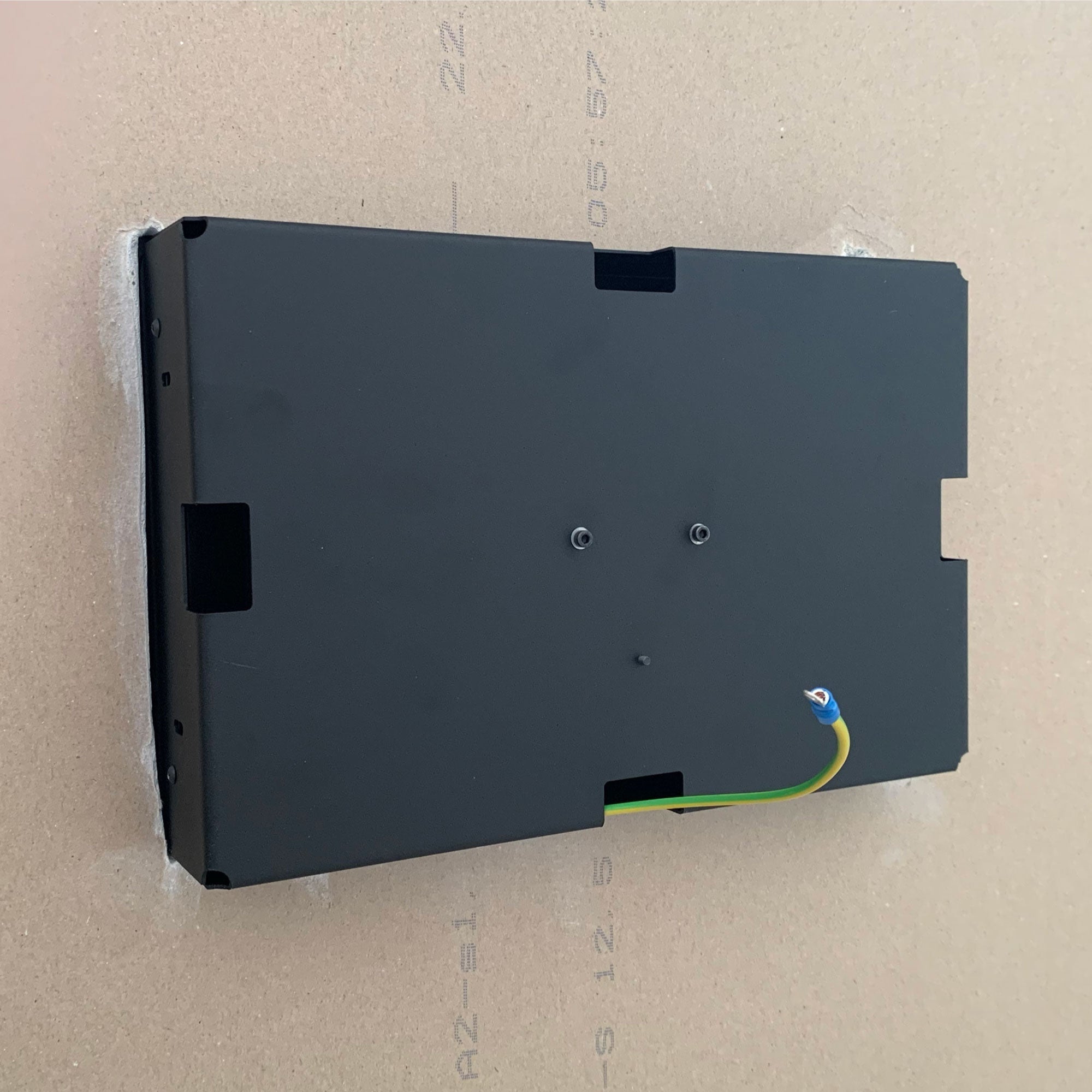 Strakke inbouwhouder voor iPad 10.2 tablet. De iPad zit veilig vast in het afneembare front dat met vier sterke magneten op de plaats gehouden wordt. Achter het front zit een ruime inbouwdoos waar kabels en voeding gemonteerd en opgeborgen kunnen worden.