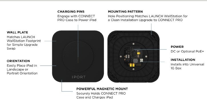 Connect PRO maakt gebruik van inductie, wat betekend dat het iPad (bevestigd in de case) direct wordt opgeladen zodra de case in contact komt met Basestation of Wallstation. Dit zonder gebruik te maken van de connector of kabel(s). De bevestiging tussen de station en de case is via krachtige magneten. Handig voor het veilig ophangen van de iPad en toch met een beperkte kracht van het Station kan worden gepakt.