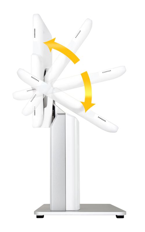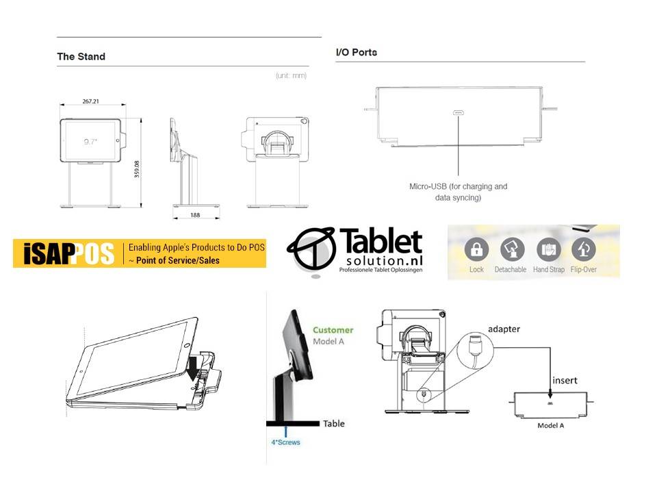 Eigenschappen: -Stevige tafelsteun van aluminium en kunststof onderdelen kan los staan of vastgeschroefd worden door de balie. -De iPad zit in een afneembare beschermcase met dockingconnector, geen gepruts meer met power kabels. De iPad wordt gelijk opgeladen als deze terug op de standaard wordt gezet. -De beschermende iPad case is voorzien van een handstrap voor beter draagcomfort. -Flip-over design: De iPad kan op de standaard naar twee zijden "geflipt" worden; van medewerker naar klant. Handig als er op de iPad een handtekening door de klant gezet moet worden. -De iPadcase wordt op de standaard vastgeklikt en kan weer verwijderd worden door de vergrendelknop in te drukken. Het is ook mogelijk de "lock" stand te activeren waardoor de iPad case niet meer te verwijderen is (anti-diefstal stand).