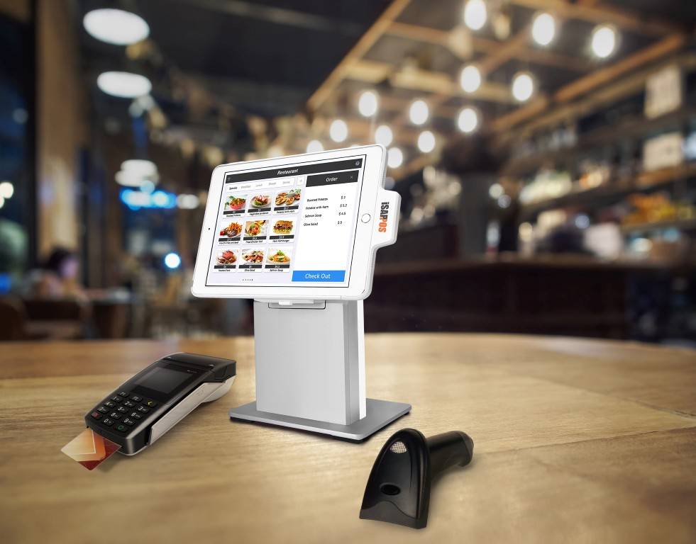 POS tafelstandaard met afneembare iPad in beschermende case (iPad Air 2/Pro 9.7) in beschermhoes. Flip-over design