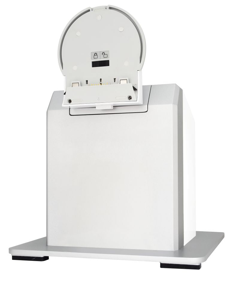 Technische gegevens -Gewicht 2.6 kg. -Manual jacket release. -Afmetingen 266 (W) x 189 (D) x 358 (H) mm (met Ipad case: 332 (W) x 189 (D) x 402 (H) mm) -Micro USB power-in aansluiting inwendig (USB-Micro USB aansluitkabel wordt meegeleverd, excl oplader) in behuizing. -Standaard aluminium met kunststof afdekkap aan achterzijde. -Kleur voet en staander zilverkleurig aluminium, iPad case zwart of wit. -FCC Class A, CE, LVD -Vrijstaand of door balie montage te monteren zonder voetplaat (excl boutjes)
