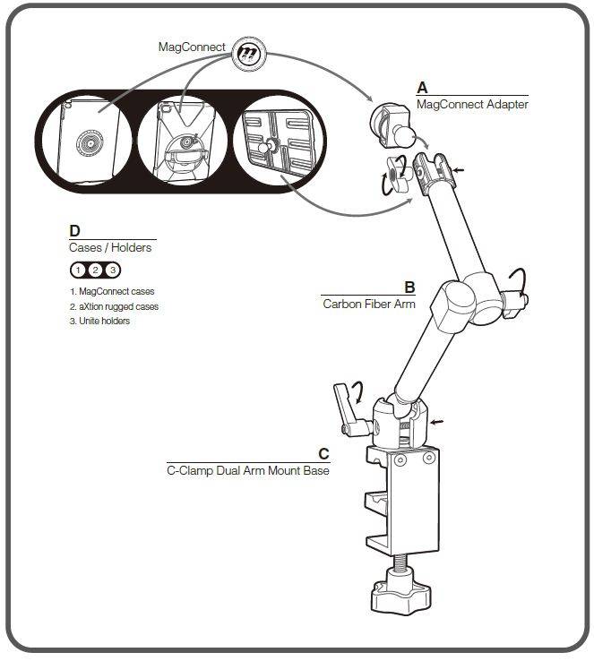 * Kan worden bevestigd op bolle of platte oppervlakken. * Maakt gebruik van MagConnect™ Technologie - eenvoudige en stevige installatie. * Kan 360° roteren en in veel verschillende standen worden gezet. * Gemaakt van carbon fiber - lichtgewicht en zeer sterk. * De verwijderbare iPad-houder is compatible met de Apple Smart Cover en alle MagConnect™ mounts.