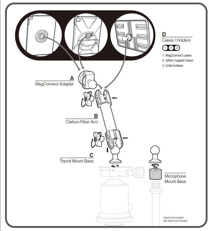 * Kan worden bevestigd op alle standaard driepoten en microfoonstandaarden (adapter meegeleverd). * Gemaakt van carbon fiber - lichtgewicht en zeer sterk. * Maakt gebruik van MagConnect™ Technologie - eenvoudige en stevige installatie. * Kan 360° roteren en in veel verschillende standen worden gezet. * De verwijderbare iPad-houder is compatible met de Apple Smart Cover en alle MagConnect™ mounts.