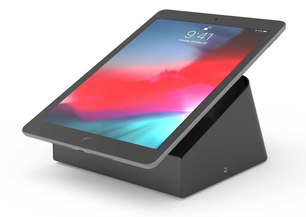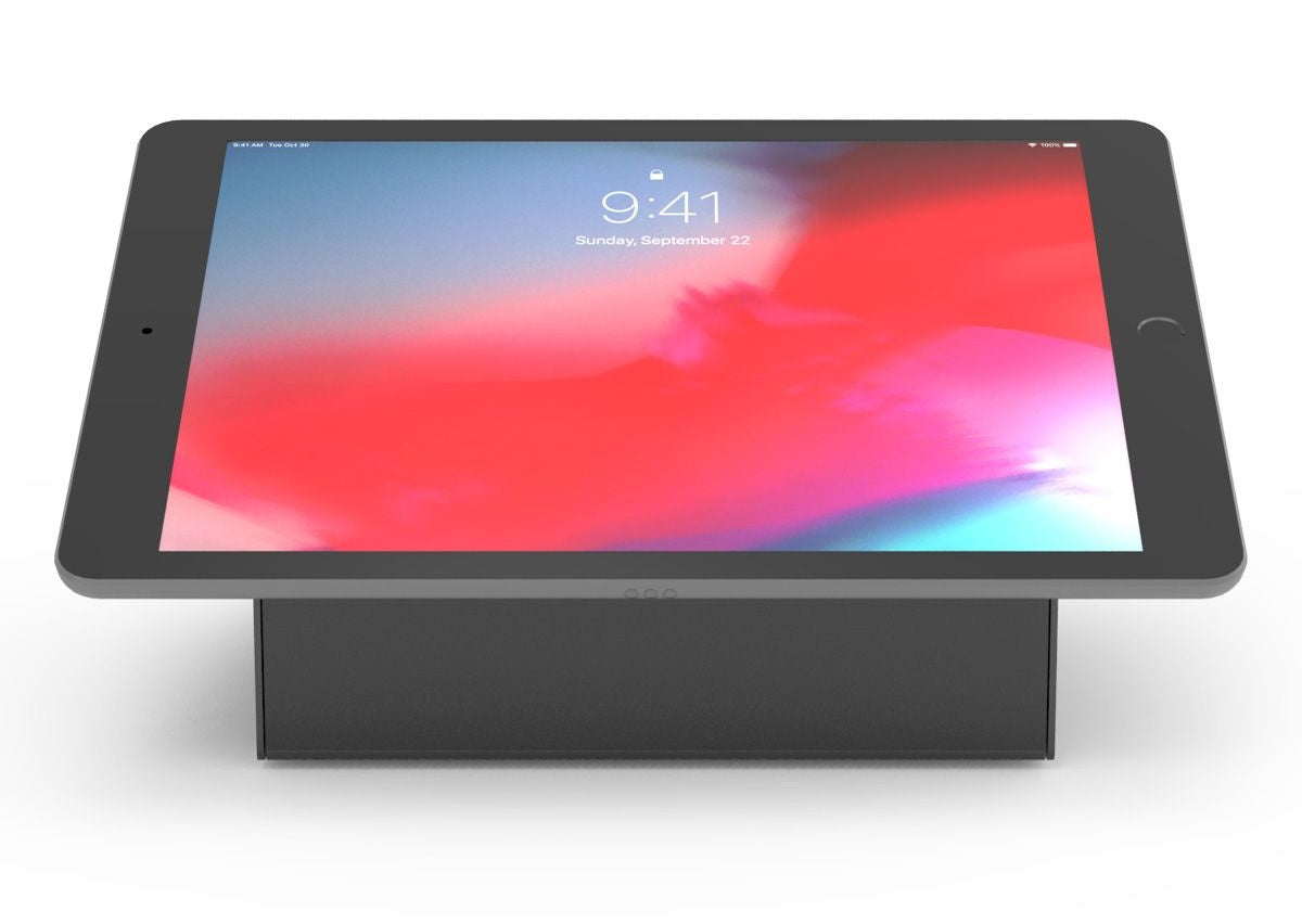 - Innovative universal solution compatible with any tablet - Designed for Audio Video Conference Rooms and Telecommunication applications - Continuous Charging While Mounted - Full Reverse Screen Tilt - Weight Balanced Base - Can Be Bolted to the Surface - High-Grade Steel Kiosk