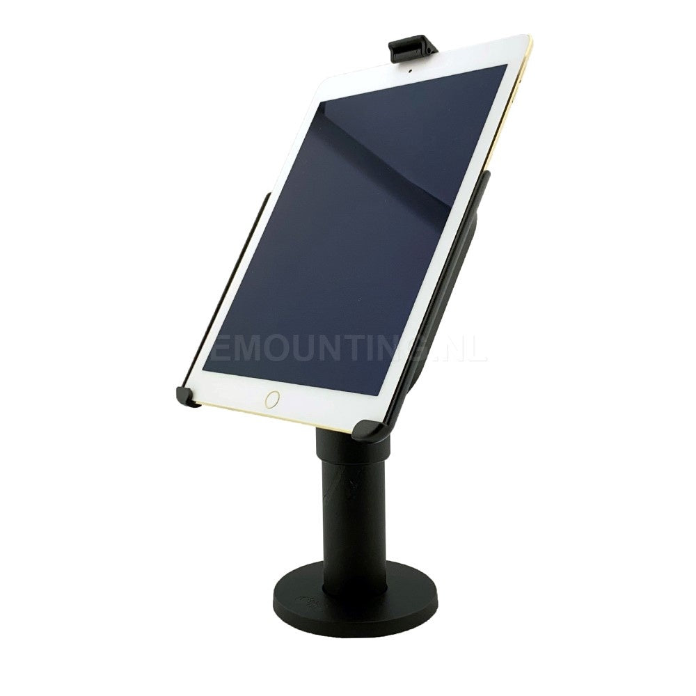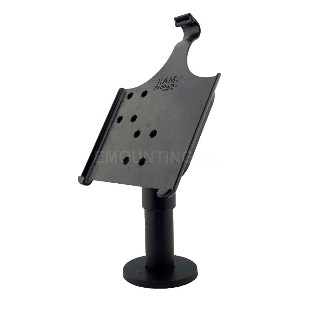 De solide en bewegelijke Spacepole tafelstandaard voor vaste montage uitgerust met een RAM Mounts iPad Slide-in houder. De combinatie is ook aan de wand te monteren zodat een kantelbare houder ontstaat (de rotatie kan dan gefixeerd worden).