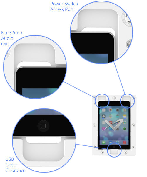 Er is ruimte voor audio en kabels aansluiting. Wij adviseren het gebruik van een haakse kabel om knikken van een recht snoer te voorkomen (20 mm ruimte). De aan/uit knop is te bereiken zonder dat de iPad verwijderd hoeft te worden.