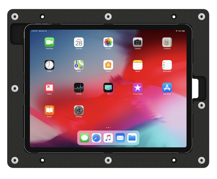 Een kunststof low-profile wandhouder met verwijderbare frontplaat geschikt voor iPad Pro 12.9. Zeer geschikt voor domotica oplossingen in huis en bedrijf (geen anti-diefstal voorziening).