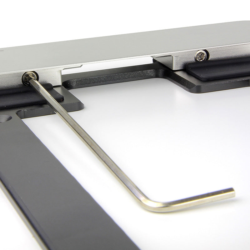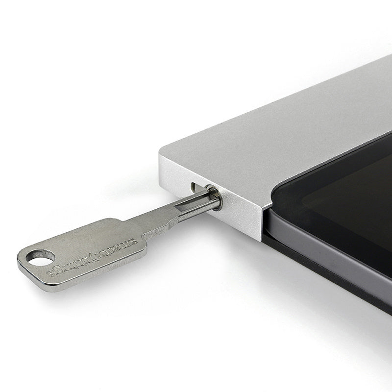 Afsluitbare wandhouder voor permanente tablet-installaties. Zeer dun, slechts 12 mm. Geen extra frame aan de lange zijden, wat een esthetisch pluspunt is, waardoor alle knoppen en andere elementen (bijv. microfoon) toegankelijk blijven.