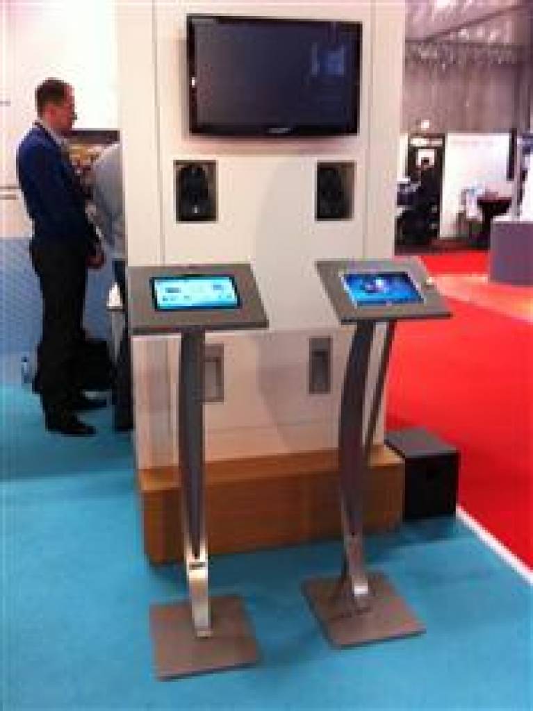 Het oplaadsnoer van de tablet is geheel afgeschermd voor de gebruikers. Het snoer loopt door de holle buis en komt onder de voet uit (afhankelijk van de stekkers). Vandaar kan het in de stroomadapter gestoken worden.