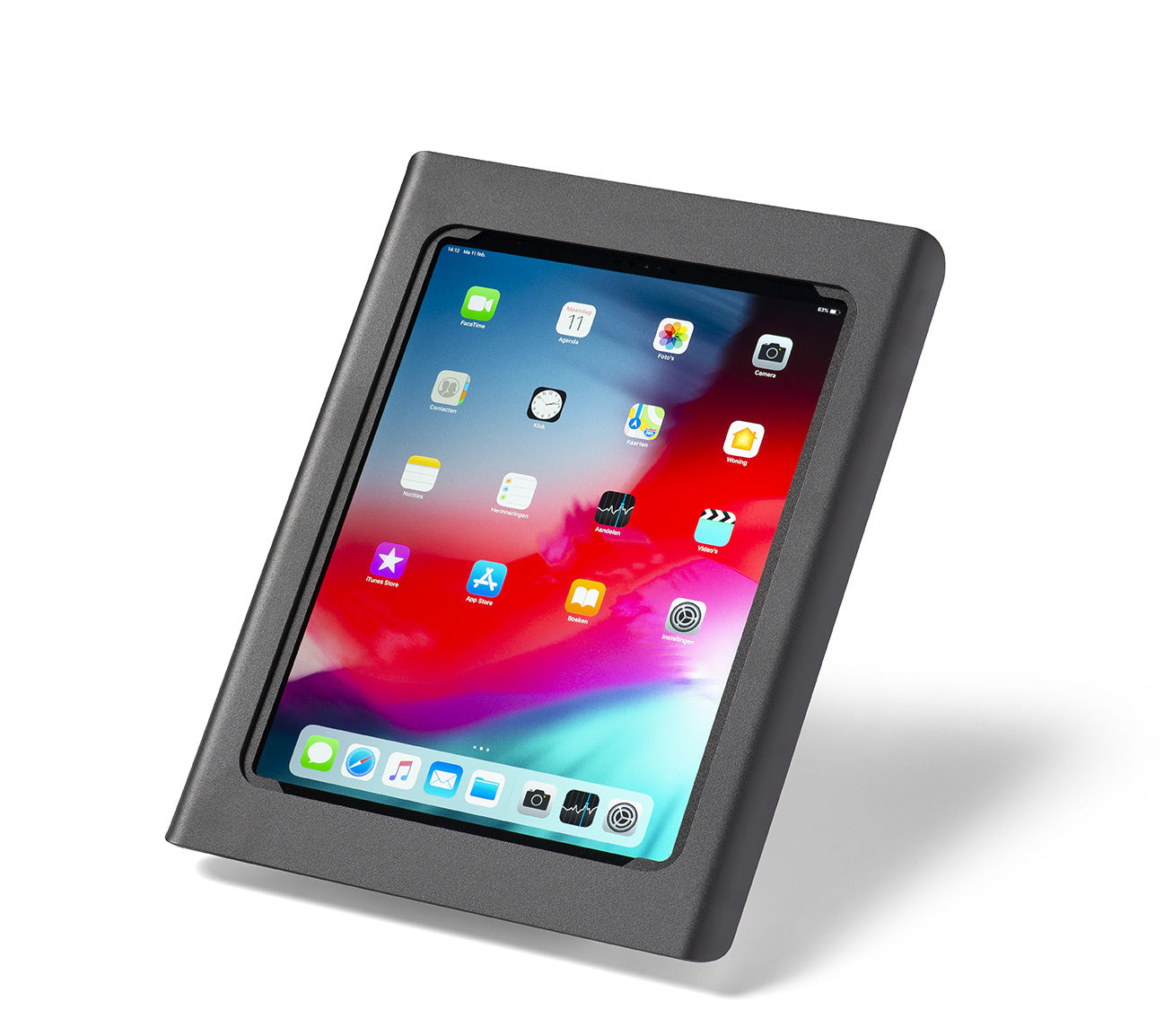 De tablet wordt in de houder op de plaats gehouden door celrubber frame en afgedekt met een passepartout (speciaal voor 3e generatie iPad Pro 12.9-inch (model 2018).). De stalen voor en achterzijde worden verbonden met pintorx schroefjes die zorgen voor de anti-diefstal afsluiting.