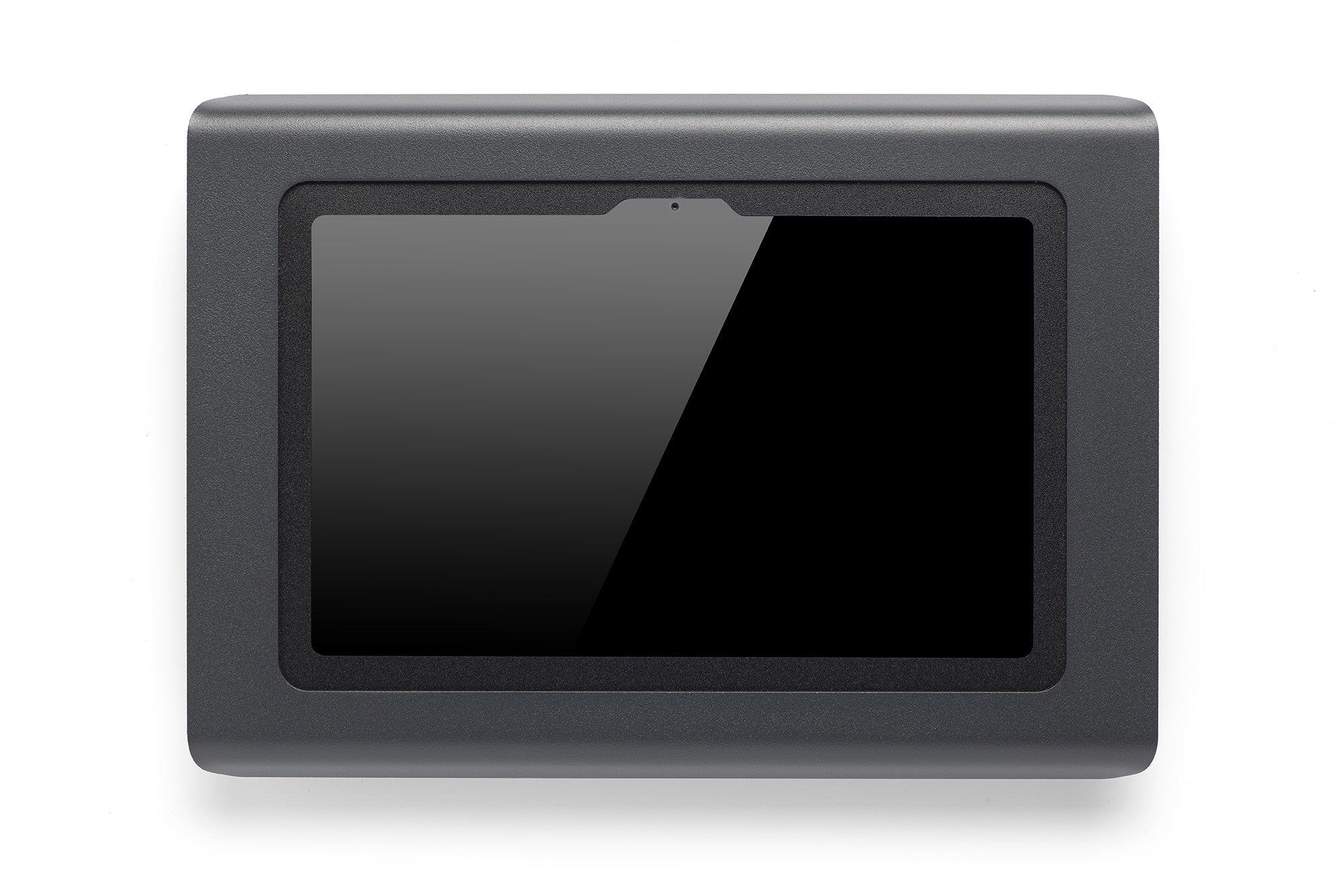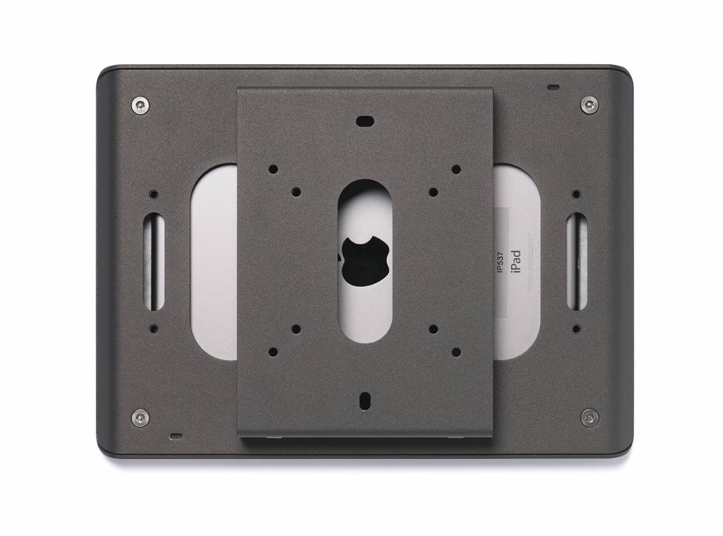 De tablet wordt in de houder op de plaats gehouden door celrubber frame en afgedekt met een passepartout. De stalen voor en achterzijde worden verbonden met pintorx schroefjes die zorgen voor de anti-diefstal afsluiting.