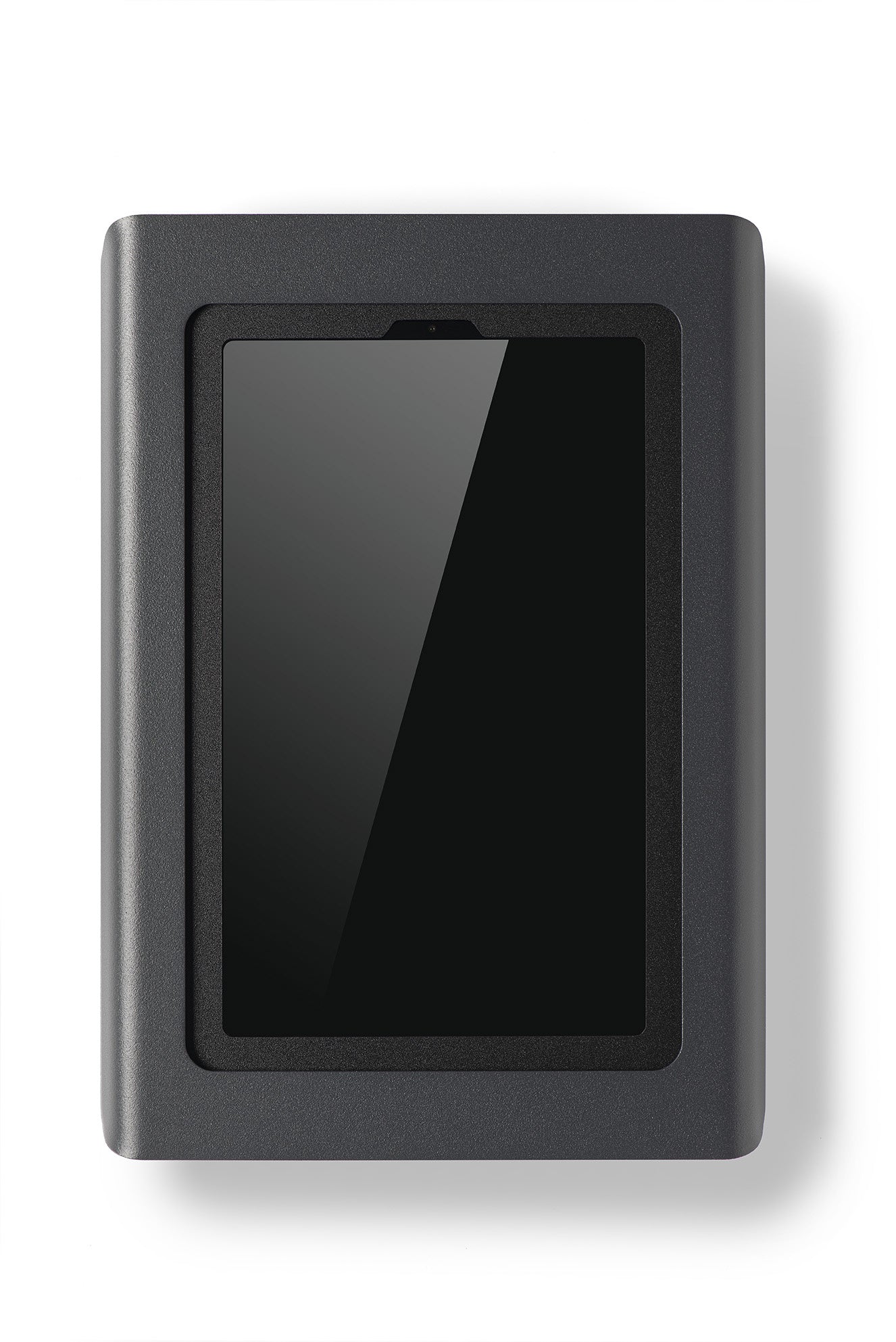De tablet wordt in de houder op de plaats gehouden door celrubber frame en afgedekt met een passepartout. De stalen voor en achterzijde worden verbonden met pintorx schroefjes die zorgen voor de anti-diefstal afsluiting.