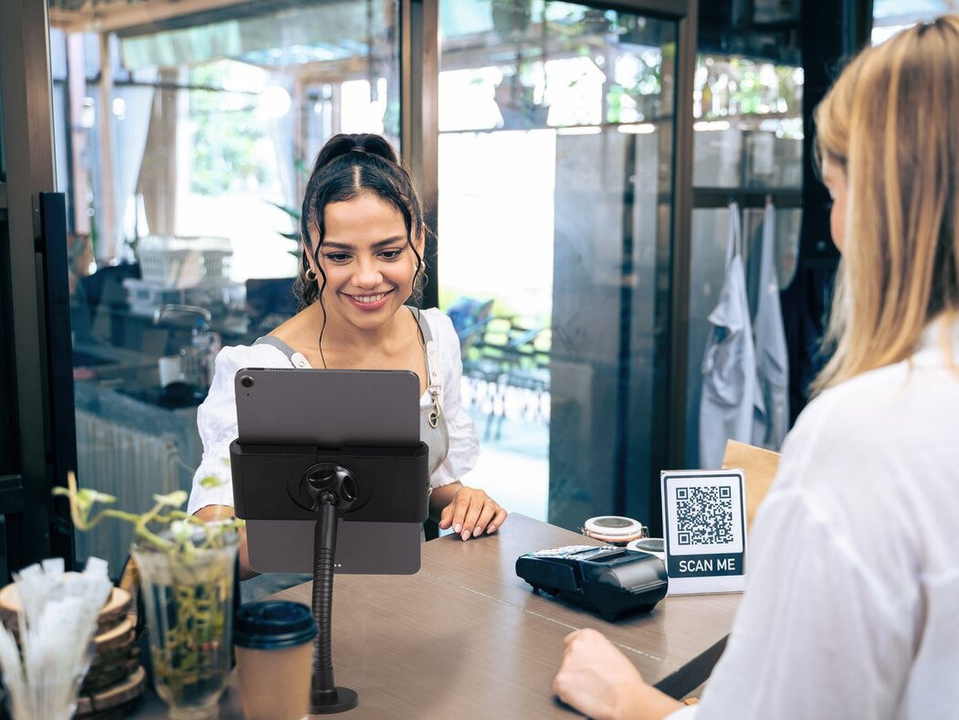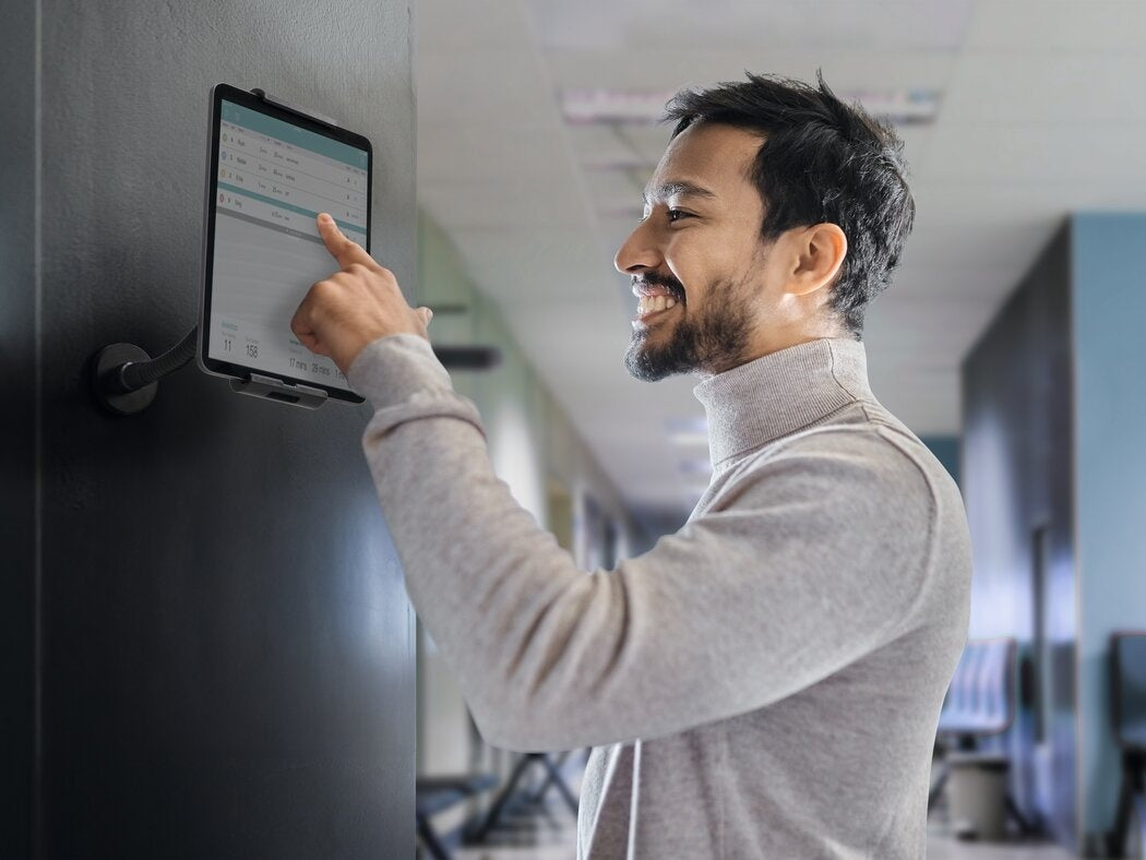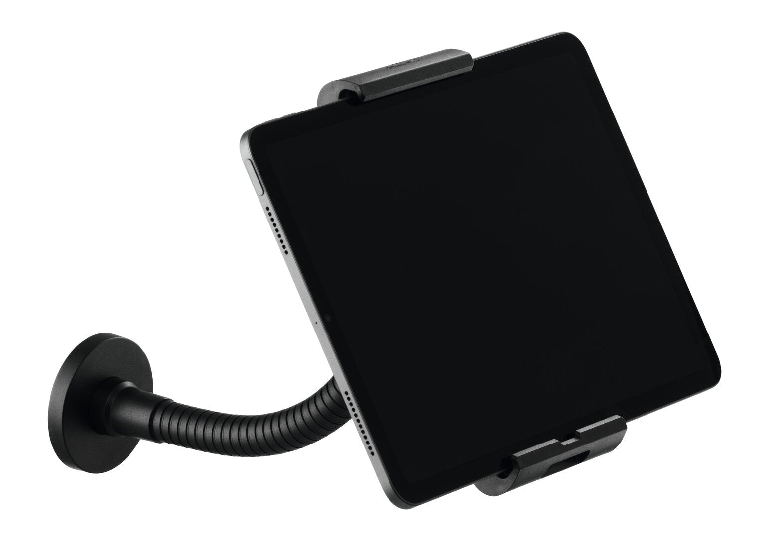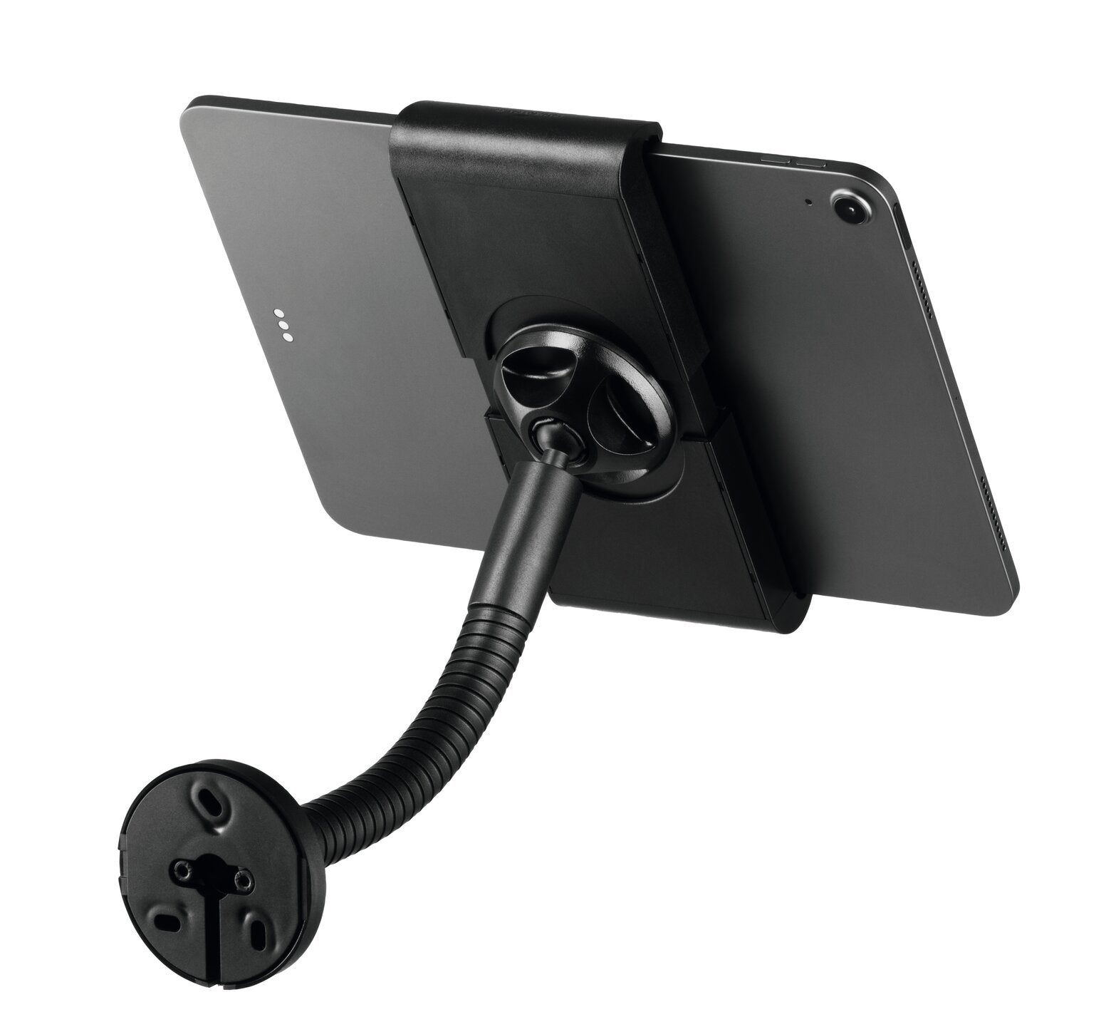 - Tablethouder voor wand- en tafelmontage van vlamvertragend materiaal met flexibel kogelgewricht en zwenkarm
