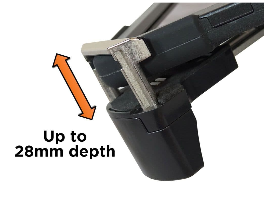 Onze nieuwe armourdog® flexibele beveiligingshouder heeft een innovatief, gepatenteerd framesysteem dat tablets van alle formaten van 7,9 "tot 13" mogelijk maakt met een dikte van max 28 mm. De aanpasbare "schouders" werken met een ratelarm die de tablet op zijn plaats vergrendelt en vervolgens stevig op zijn plaats houdt met het meegeleverde Kensington-beveiligingsslot.