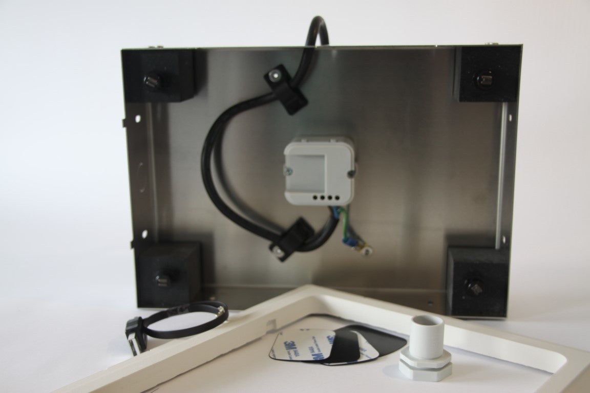 Voorwaarde bij montage in systeemwand is een dubbele gipsplaat. De montageadapter (gipskader) heeft dezelfde hoogte als een gipsplaat (12,5 mm) en maakt zo een naadloze hechting mogelijk met het oppervlak en voorkomt scheuren. Voor de massieve wand zal de montageadapter (gipskader) op de wand gemonteerd worden. De constructie van de inbouwbak maakt het verbergen en vastzetten van de aansluitkabel kabel mogelijk. Bedoeld voor thuisgebruik en ruimtes met toezicht.