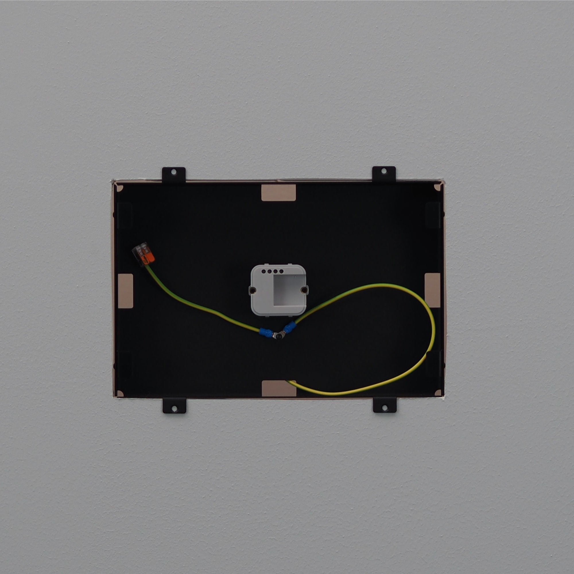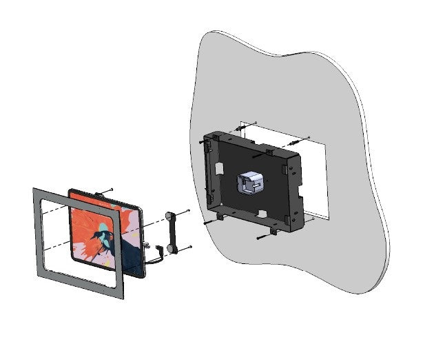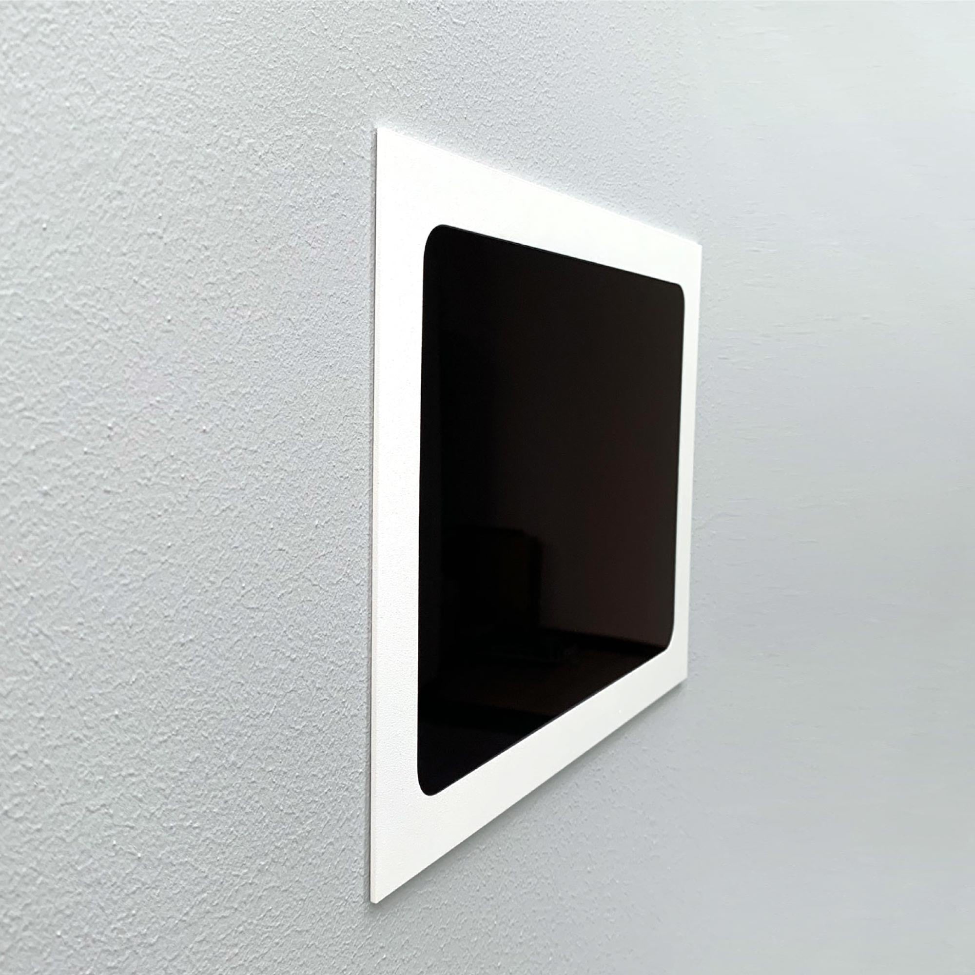 Strakke inbouwhouder voor iPad tablet. De iPad zit veilig vast in het afneembare front dat met vier sterke magneten op de plaats gehouden wordt. Achter het front zit een ruime inbouwdoos waar kabels en voeding gemonteerd en opgeborgen kunnen worden.