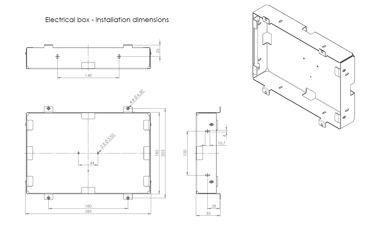 Houder bestaat uit een CNC-gefreesd aluminium voorframe en een stalen inbouwdoos (voor eenvoudige installatie in gipsplaat en bakstenen muren. Het afdekframe is slechts 2 mm dik.