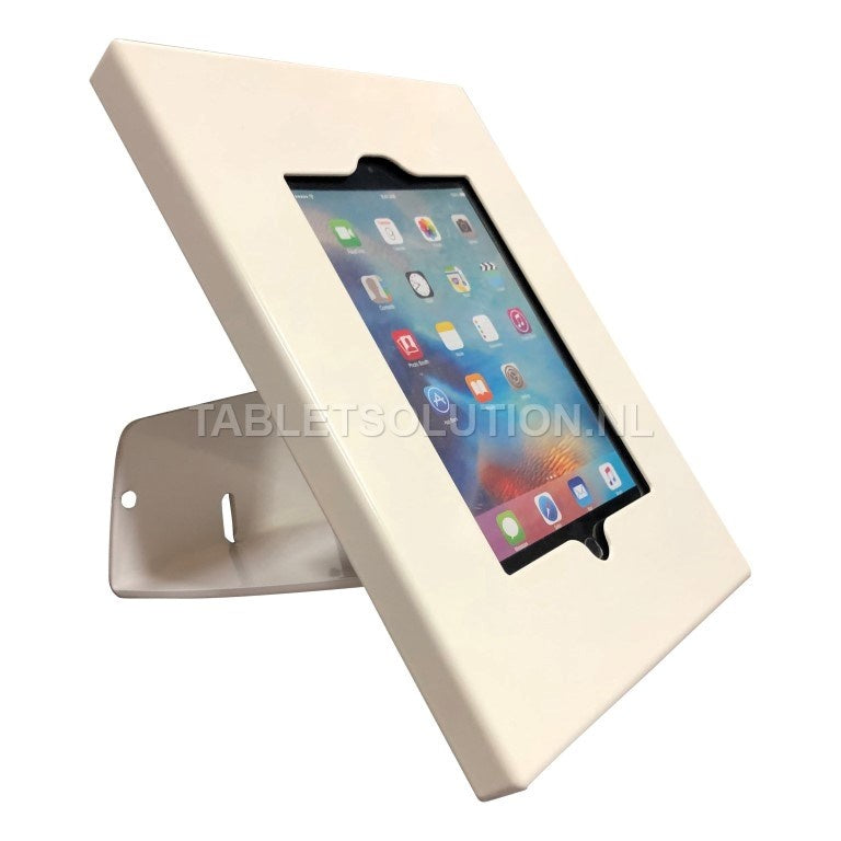 De deksel is afsluitbaar met het ingebouwde cilinderslot. Het USB-snoer van de iPad kan in de houder weggewerkt en kan via de muursteun geleid worden.