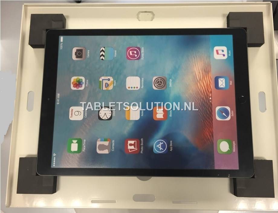 De deksel is afsluitbaar met het ingebouwde cilinderslot. De iPad kan zelf naar keuze in portrait of landscape gemonteerd worden (vaste montage).